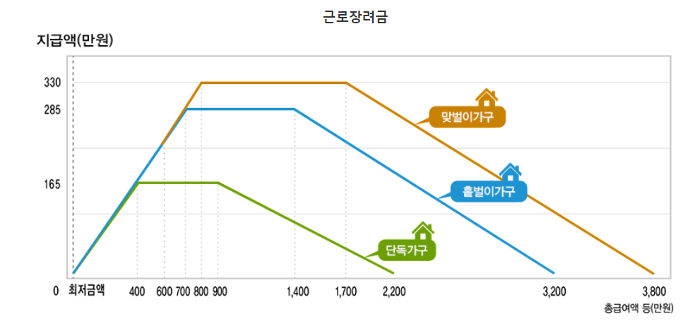 근로장려금은 소득 기준을 충족하여야 합니다. 소득 기준은 아래 표와 같습니다.